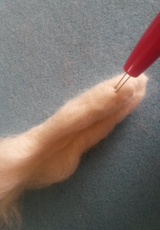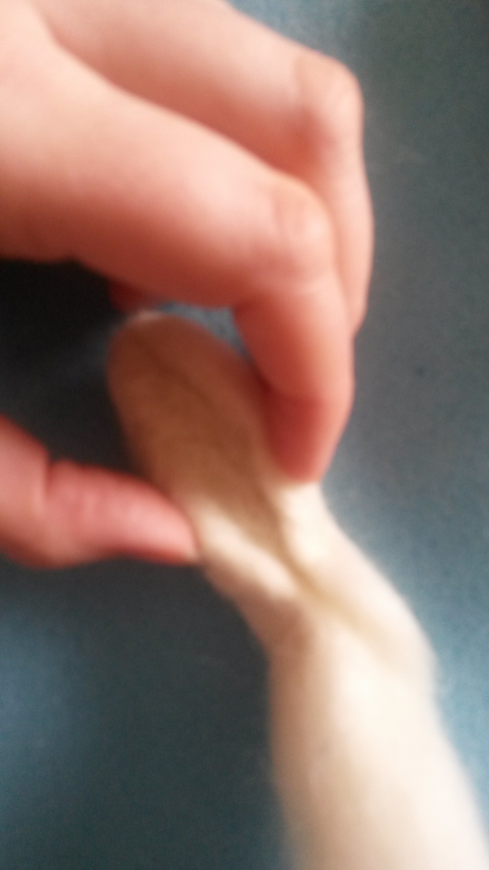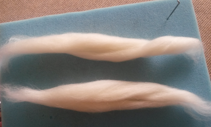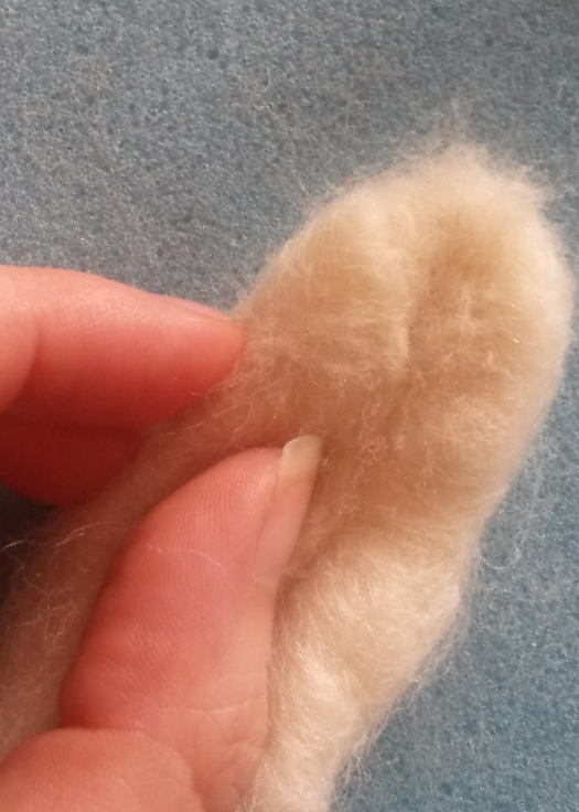 Step 1: take two equal lengths (and density) of your core wool (corriedale in this case). Bear in mind that you will need the two ears to end up the same size so keep comparing them. I find it works better if I do a bit on one then do a bit on the other as I go along rather than finish one and then start the other afterwards.