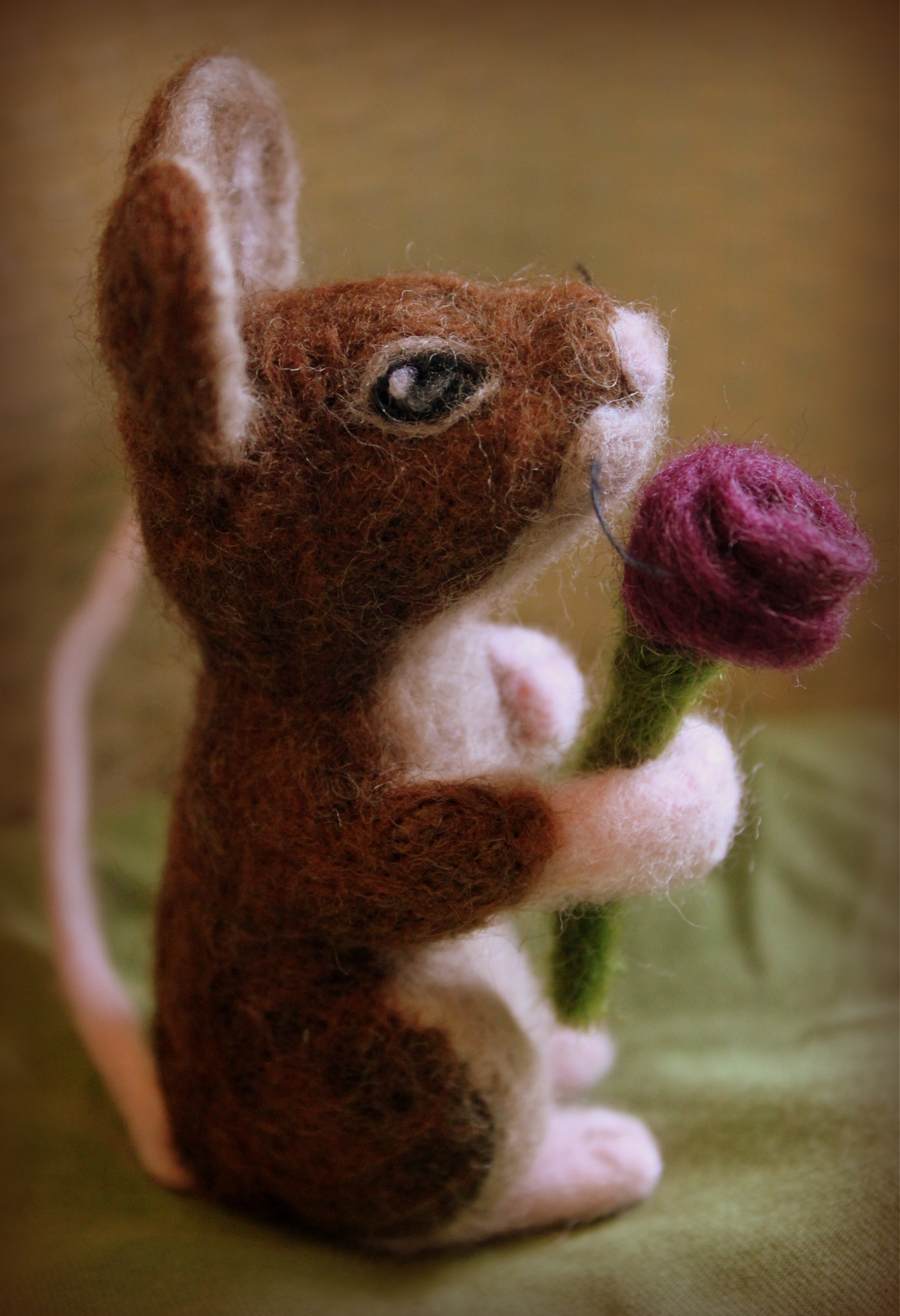 His core is made of natural undyed Corriedale wool from New Zealand. His fur and detail on his cute mousey paws, ears and face are of soft merino wool (non-mulesed) from South Africa (Cape) – chocolate brown, mink, raven and coral. I used coarser wools in purple and grass green for his flower to contrast with the soft contours of his body. You can see his size from the close up of me holding him in my hand. His eyes are made of wool too, so no glass or plastic but all 100% wool!