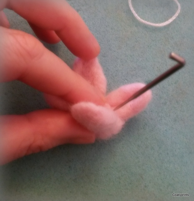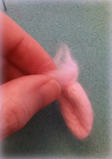You only need to pull off a tiny bit of wool for this part. I chose a pearly white to match the pearl on the flower.