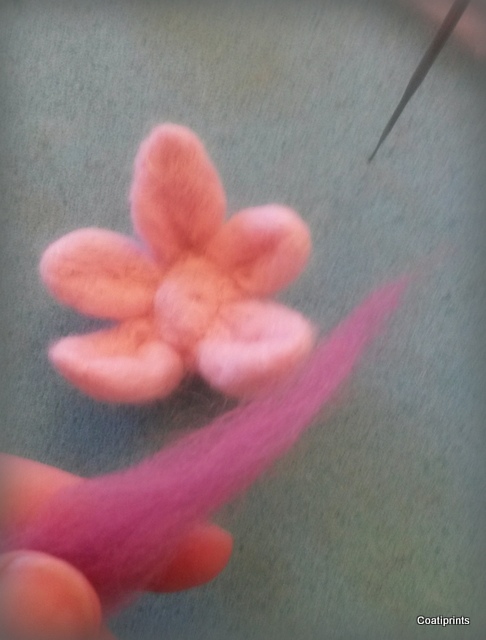 Shallow felting like this will ensure that the darker pink doesn’t show through when you turn the flower over