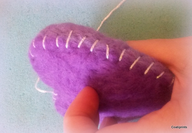 You can leave the heart as it is or you can sew around the edge for extra effect. Now as you can see my sewing skills are not the best (which is why I love needle felting!) but here you can see I have sewn a simple stich around the edge with a sparkly silver-white wool. NB the joy of felting is that you can felt over any knots or loose ends to finish off! I am sure your heart will look far neater than mine.