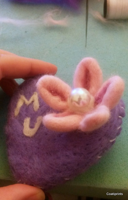 My mum just loves flowers (see the little mouse I made for her previously) so I wanted my heart to stand out with a flower. This is a simple design of 5 petals which you make separately and then felt together in the middle. You can then make a simple centre out of wool or (as I have done) accessorise with a shiny button or bead.
