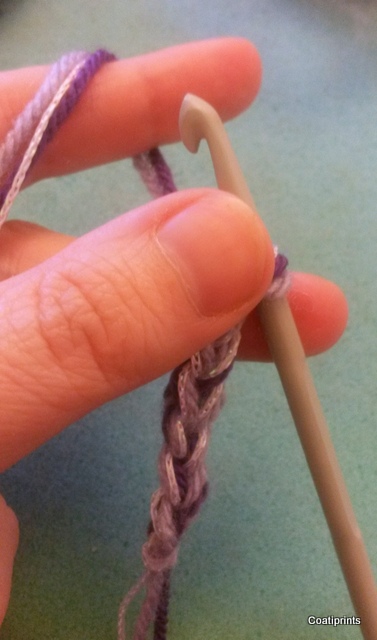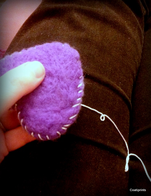 So I took three strands of knitting wool, one dark purple and one lilac each to match the colours of the heart and the third strand was the same glittery wool I used for the edge of my heart.