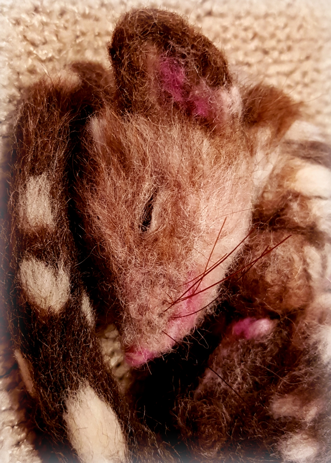 She is an adorable baby Tiger Quoll (a wonderful and unusual looking marsupial from Australia). She is sound asleep all curled up, be careful not to wake her!!