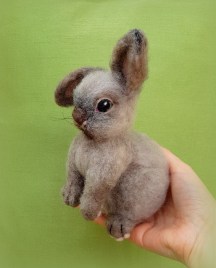 Firstly I used normal barbed felting needles to sculpt her shape with the core wool and add the colour with the merino wool. Once I had added a layer of white merino wool over her body I then added a layer of ‘pewter’ (dark grey) merino wool. I then took a reverse needle (which has barbs going the opposite way to a normal barbed needle) and as I stabbed at the wool it pulled the white wool fibres (and some of the core wool) through the grey. This resulted in a fluffy light grey colour. I carefully used an eye brow brush to brush the fibres in one direction to mimic the look of baby bunny fur.