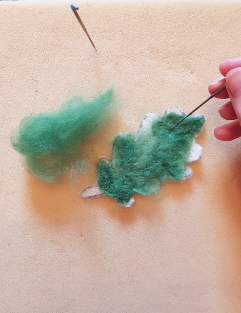 If you are gluing or sewing the leaves onto a picture/collage you won’t need to felt the other side as well. For my dormouse nest however I wanted to be able to take the leaves out the nest as separate pieces of art so I decided to felt the other sides of the leaves too.