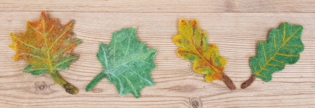 There are many ways to make needle felted leaves e.g. using leaf-shaped cookie cutters or felting sheets of wool and then cutting out the leaf shapes.