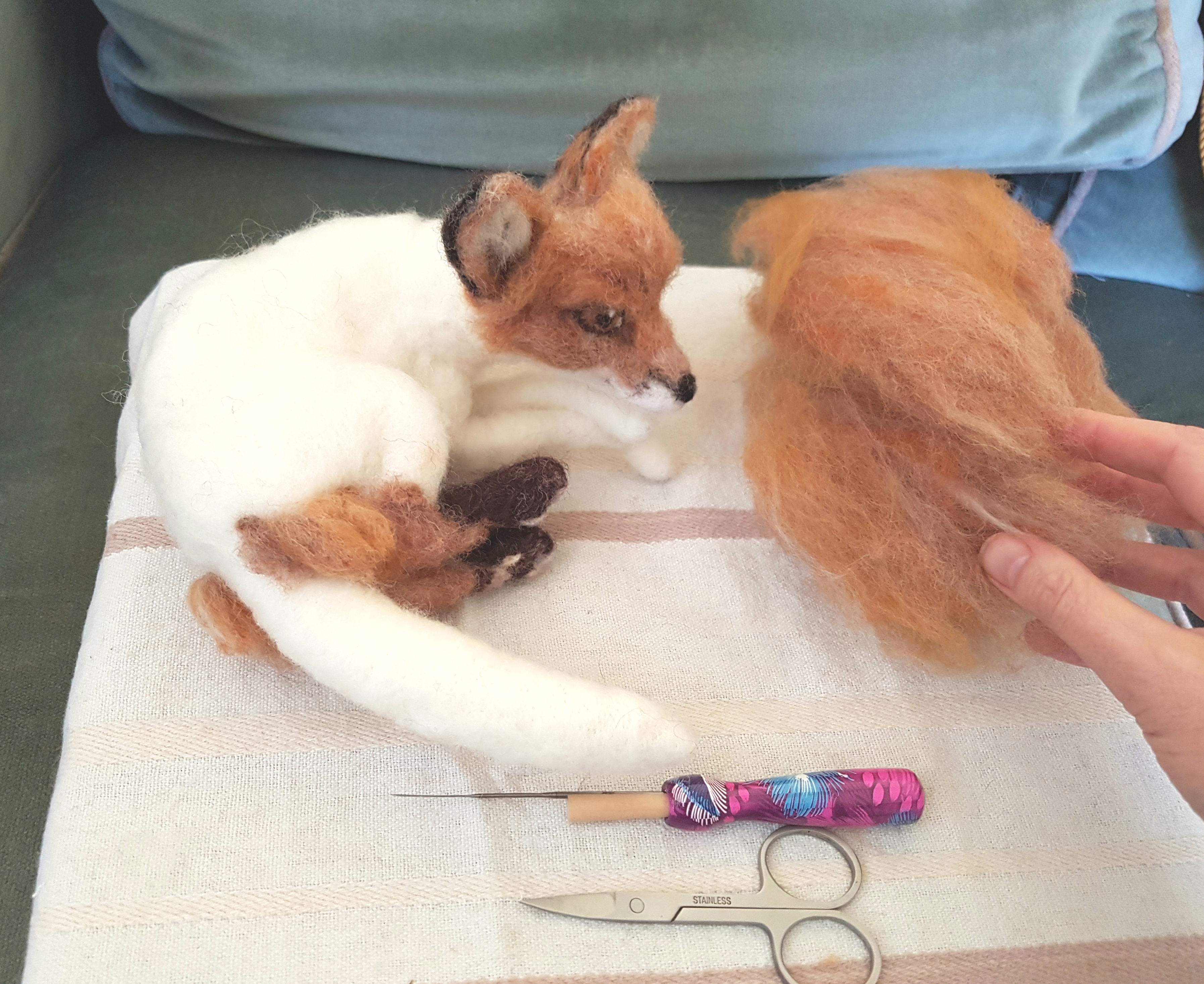 When I start sculpting an animal, I usually grab some corriedale batts or slivers to build a solid core. This type of wool felts quickly and gives a sturdy base without too much effort. Then for the outer layers—the visible fur and details—I love using dyed merino tops or alpaca blends for their smooth soft animal fur finish or for a more natural, slightly fuzzy fur texture, I love some of the rougher undyed wools e.g. Shetland.